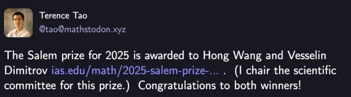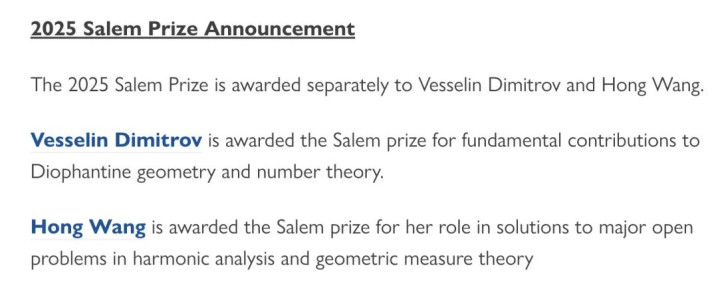 国际数学界的2025塞勒姆奖,颁发给王虹和Vesselin Dimitrov。