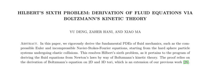 该问题是David Hilbert在1900年提出的23个数学难题之一,其中比较广为人知的包括黎曼猜想、哥德巴赫猜想等,第六题则要求学者从牛顿力学出发,通过玻尔兹曼动力学理论,推导出流体力学中的基本方程。
