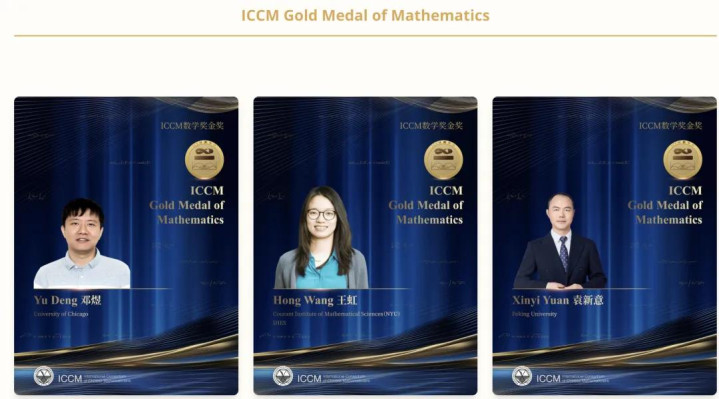 另一边则是世界华人数学家大会ICCM数学奖金奖,颁给王虹、邓煜、袁新意,三人都是北大数院校友。